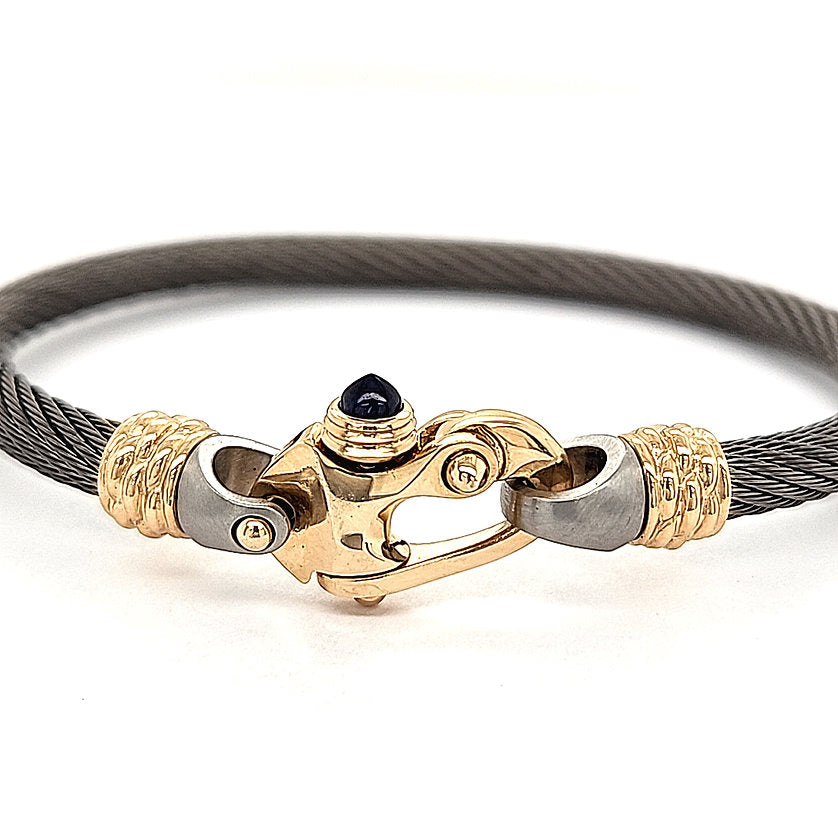 Start with the brilliance of 4.5mm Live Wire in your choice of White Ice or Black Ice steel. Next, enhance it with a 14KT Yellow Gold Mariners Clasp® for a stunning statement. In addition Braided 14KT Yellow Gold Ferrules give another stylish feature. Furthermore embraced by those that enjoy pieces of distinction, whether purchased for yourself or as a gift.