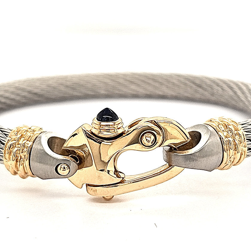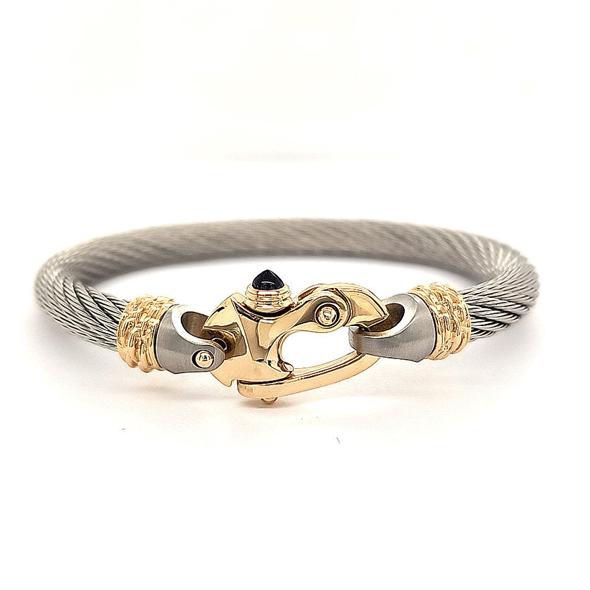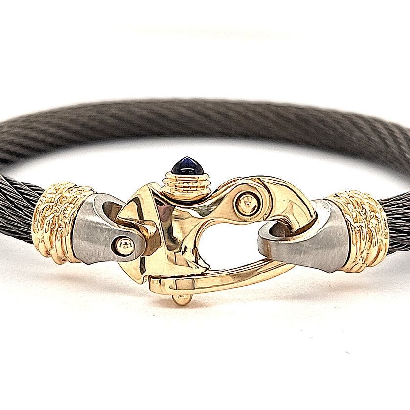 Start with the brilliance of 6.5mm Live Wire in your choice of White Ice or Black Ice steel. Next, enhance it with a 14KT Yellow Gold Mariners Clasp® for a stunning statement. In addition Braided 14KT Yellow Gold Ferrules give another stylish feature. Furthermore embraced by those that enjoy pieces of distinction, whether purchased for yourself or as a gift.